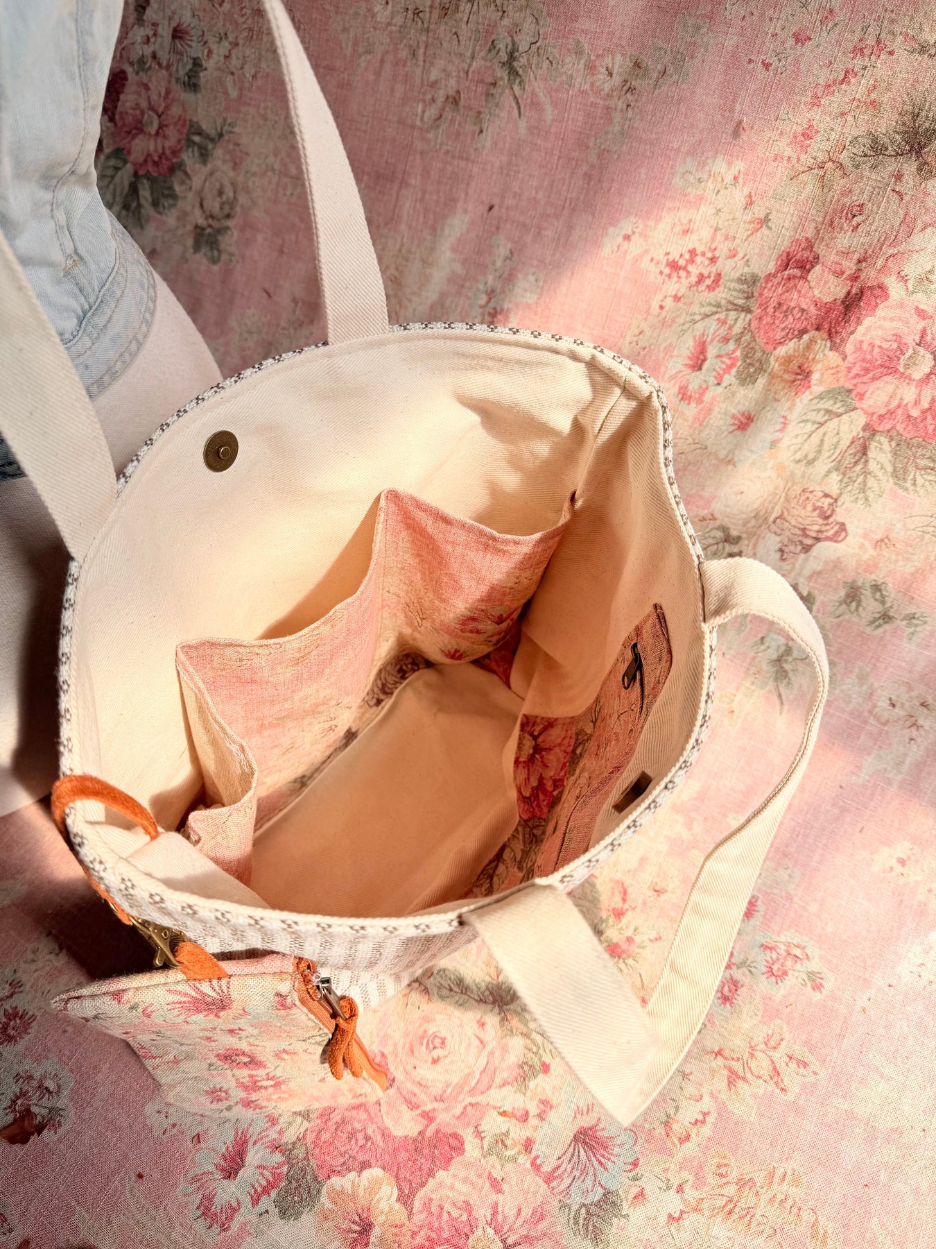 - Detachable Zipper Pouch: A coordinating pouch (7.5" x 4"), perfect for small notions, is attached inside with a lobster clamp. This clamp can also be used to hang your keys or other small accessories.