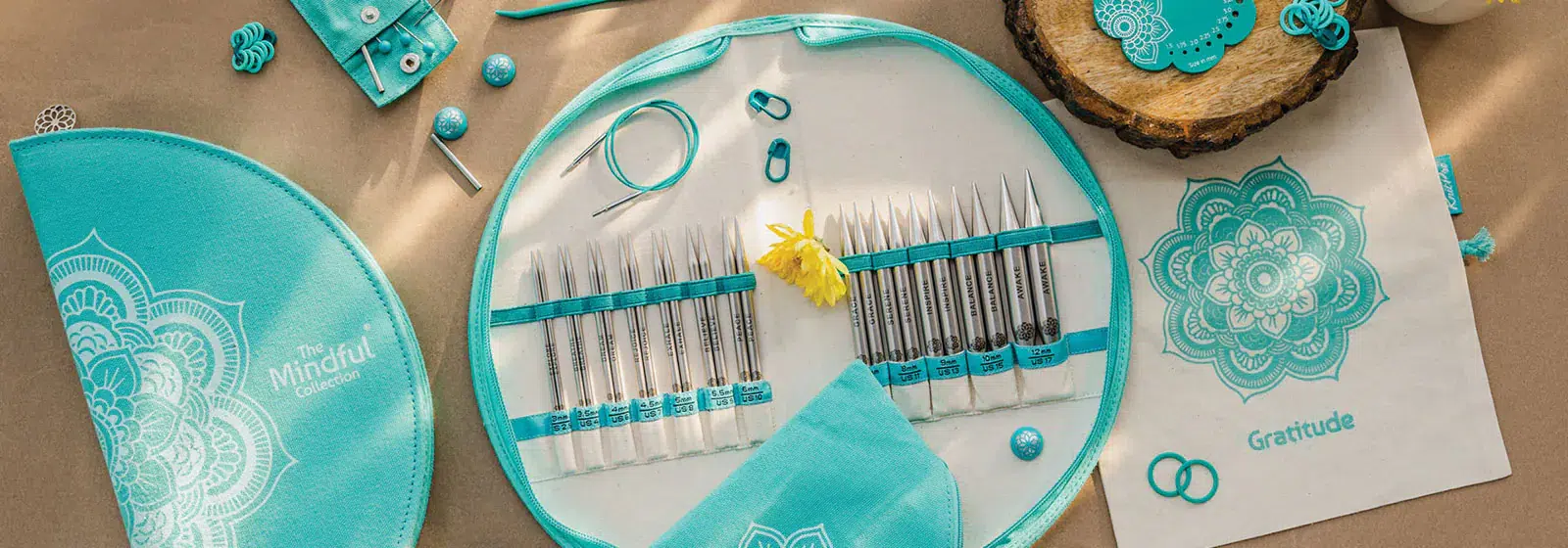 Inspirational words are printed on each needle. These needles and tools are designed to enhance knitting peace and pleasure.