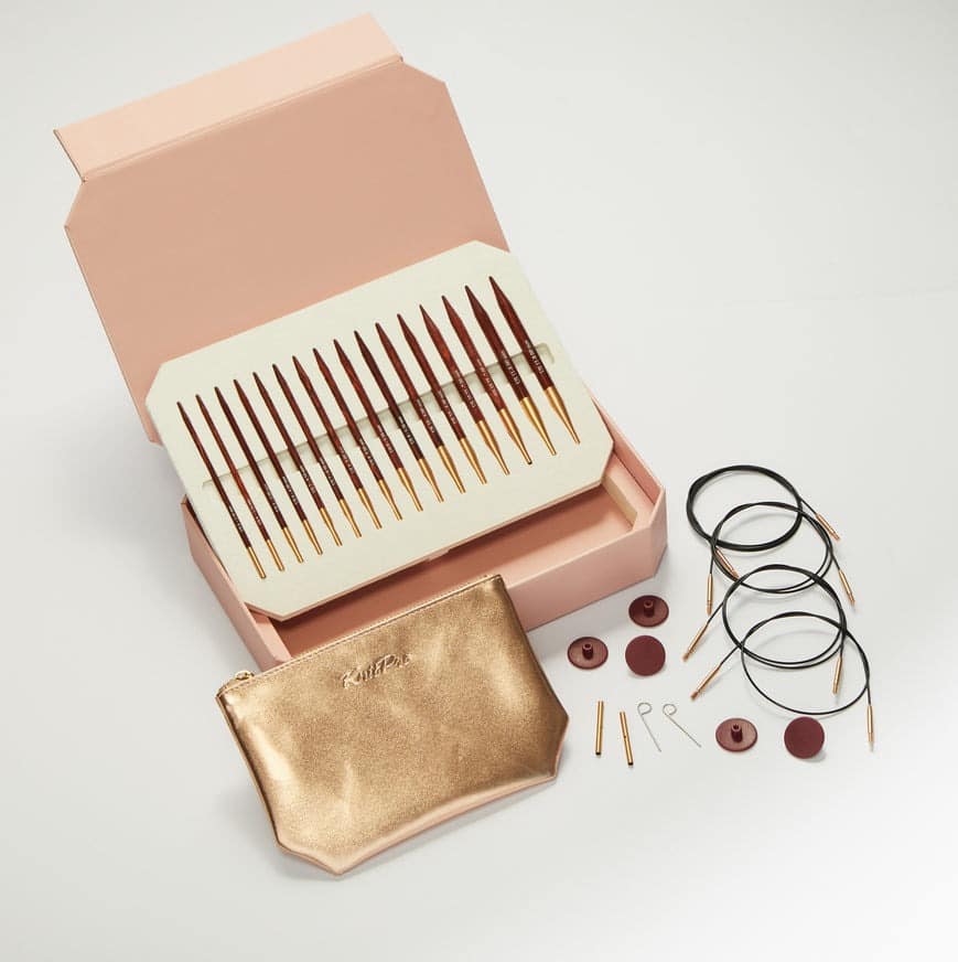 The Golden Light 2017 collector’s needle set. This beautiful boxed set consists of 9 pairs of interchangeable needle tips with matt gold connectors. Also included is a color coordinated shawl pin adorned with a fine crystal.
